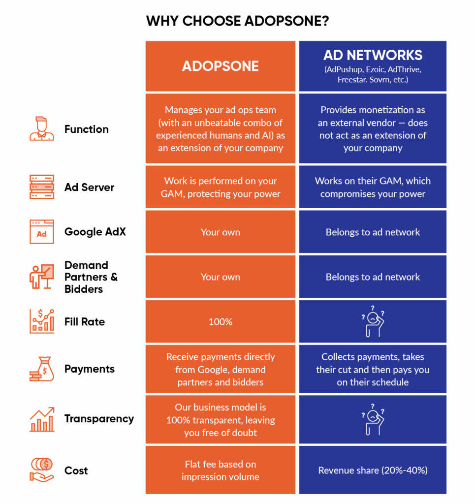 Ad networks operate as monetization vendors. AdOpsOne operates as your own in-house ad operations team.